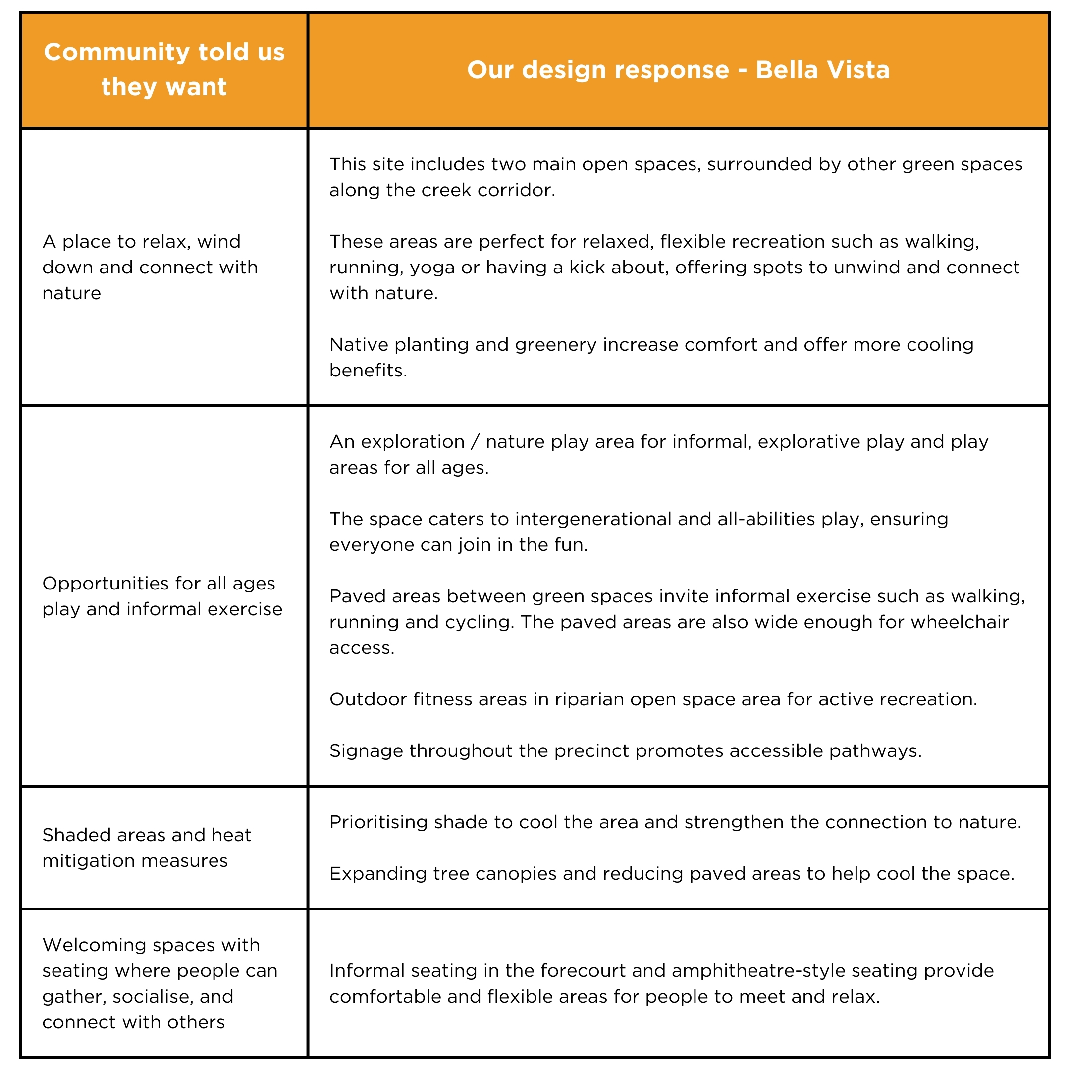 From December 2023 to February 2024, over 400 people shared their thoughts and ideas for the new open space in Bella Vista. Thank you to everyone who took the time to tell us what you value most about open spaces and how you see these aspirations coming to life in Bella Vista.