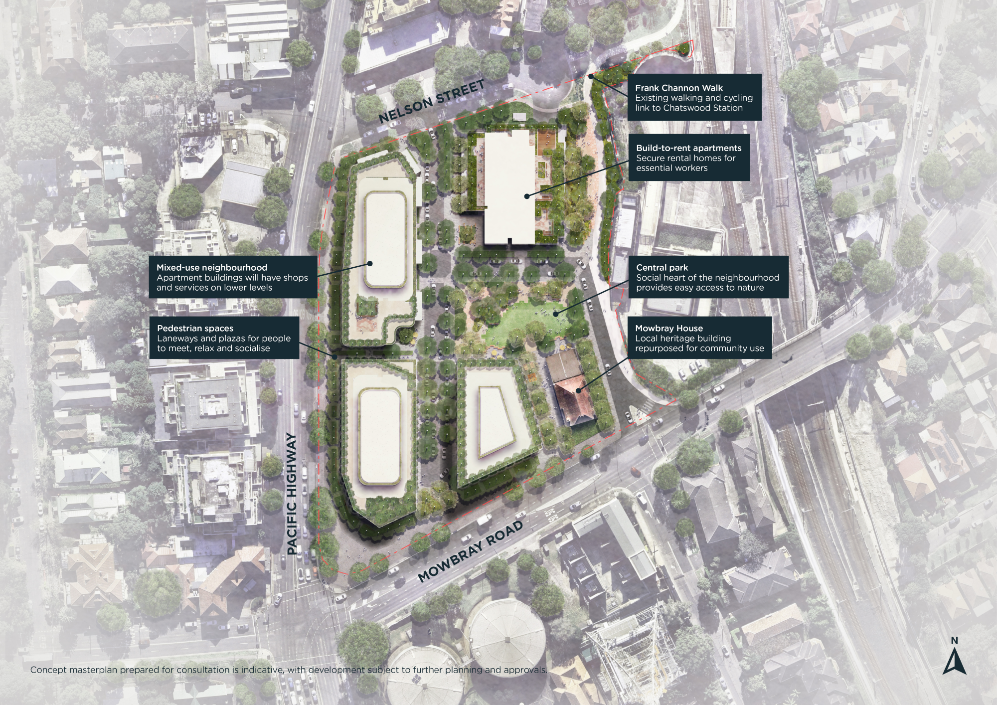 Landcom is planning to transform the former Sydney Metro construction site at 607 Pacific Highway, Chatswood, into a vibrant, well-designed neighbourhood with high quality apartments, rental housing for essential workers, shops and public spaces.
