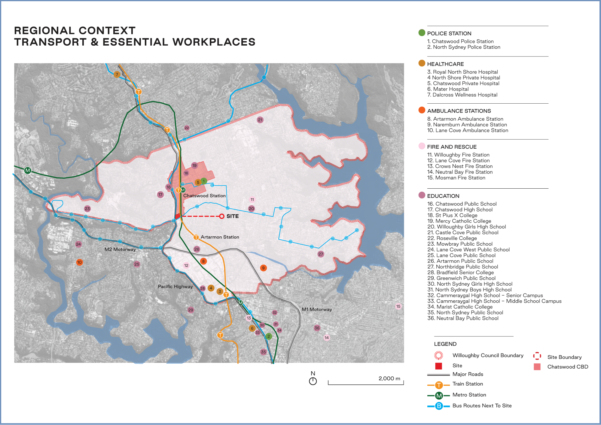 The project is conveniently located near shops and services in Chatswood's bustling city centre, as well as schools and hospitals, with easy access to train, metro and bus services. The map below shows some of the essential workplaces around the site.